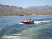 And then because I had been cooking all day. My little one decided he had to cook to. We talked about foods that go together like yogurt, mustard and ketchup don’t work well together. However, yogurt and fresh fruit go together well. So he took yogurt and added chunks of fresh fruit and chowed it down. He was happy and came up with it on his own and was please with his cooking experience. I love his creativity. And then next are pics of my little one and Dad riding the tube. I am dealing with this better. Much better when I am the person driving the boat and can just say UMMM NO! when he gives me the speed up thumb. And the three man tube he shared with a friends son.