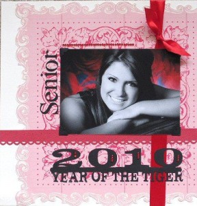 My daughter is a Senior this year – 2010 – and they are the Festus Tigers so I was thrilled to see this file that Chris designed. It is really a simple layout but the file is perfect! I didn’t want to crowd the layout with too much because I love this photo of her so I only used the title portion of the file. I also used my Wishblade to cut the word Senior to match the file Chris created. Added some pretty patterned paper, ribbon and a bit of bling.