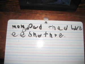I just had to share this with you as it made my heart beam. My son is learning to read and write. and I don’t for one instance tell him his spelling is wrong. I figure next year when they start correcting spelling tests and more then we will approach that topic. I don’t want him to pause for a minute when he decides to write something I just want him to write and know he got it down on paper. So I saw this  a week ago, he wrote it on a wipe board and left it on the table. It made me pause and grab my camera and of course take a picture. Did you see what it says….