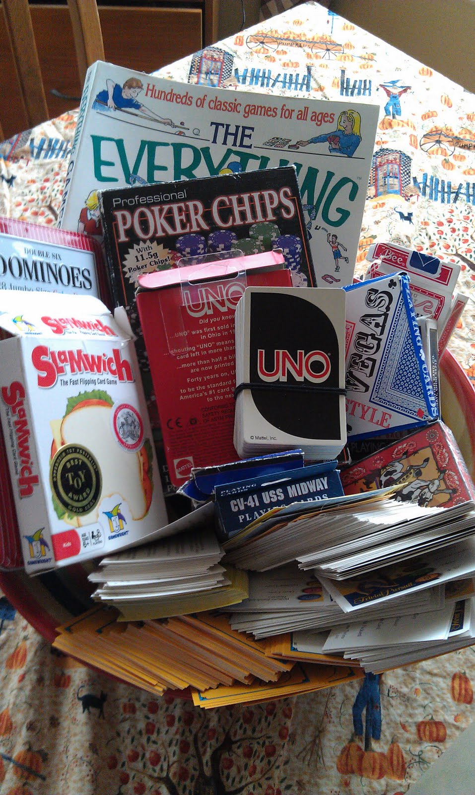 My son, like many kids, loves to play games. I must admit I like to to. Right after dinner seems to be our easiest time to fit one in. I usually put out a bowl filled with cards and things when we have company over. There are many times a good card game starts up and some play and some watch and many chat. My hubby loves trivia so a few of those cards to are a good brain storm. This last time I put it out I left it on the table. If we sit down to dinner, we seem to clear the table and play a quick game of uno or go fish. (The dishes can wait.) The book is all about card games and the rules for them. This works well when we have a discussion about the rules or if we want a new game to try. I highly recommend a bowl of cards as a table centerpiece. Yes a nice candle is pretty,but no fun unless you are a pyro. But a bowl full of card games really can make life slow down for a moment and make my son smile the biggest smile when he yells UNO!! My hubby's family plays a card game called Nerts. It is a lot of fun, fast paced and tons of folks can play. Have you ever heard of it? What card games do you play? Here is to more fun and playing in the new year and lots of smiles!